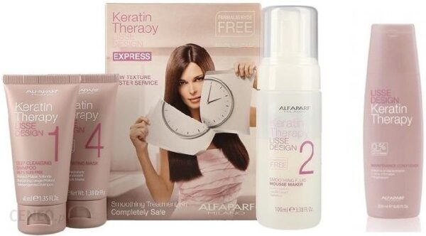 W skład zestawu wchodzą: Keratin Therapy Smoothing Treatment Kit – specyfiki umożliwiające przeprowadzenie zabiegu keratynowego prostowania włosów oraz odżywka do pielęgnowania pasm po zabiegu.