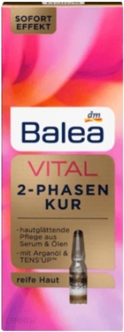 Dla potrzeb skóry dojrzałej: 2-fazowy produkt Balea VITAL łączy skuteczność serum z odżywczymi właściwościami olejków roślinnych. Krótkie wstrząsanie łączy dwie fazy i powstaje skuteczna mieszanina surowicy i oleju. Faza wodna z roślinnym składnikiem aktywnym promuje świeży, młodszy wygląd z natychmiastowym efektem: skóra wydaje się gładsza, zmarszczki są wizualnie zmniejszone. Faza olejowa z olejem arganowym i słonecznikowym zapewnia intensywną pielęgnację i pomaga utrzymać naturalny bilans nawilżenia skóry.